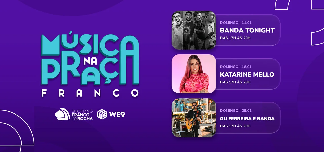 Prepare-se para curtir boa música ao vivo no Shopping Franco da Rocha! Aos domingos, o projeto Música na Praça reúne shows gratuitos para transformar sua experiência de lazer em momentos cheios de ritmo e emoção.